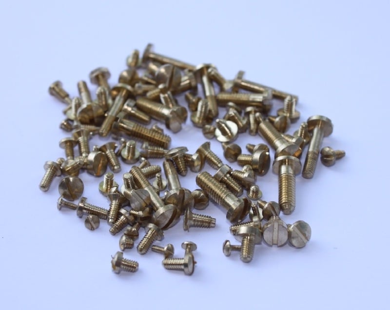 Set of approximately 100 brass screws in various sizes including many mini screws.