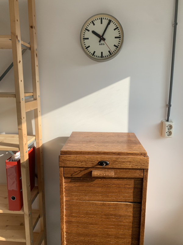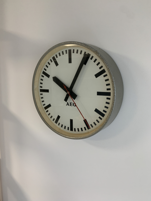 Deze klok wordt voorzien van een nieuw quarzt uurwerk wat het oude electrische uurwerk vervangt zodat het draadloos opgehangen kan worden.